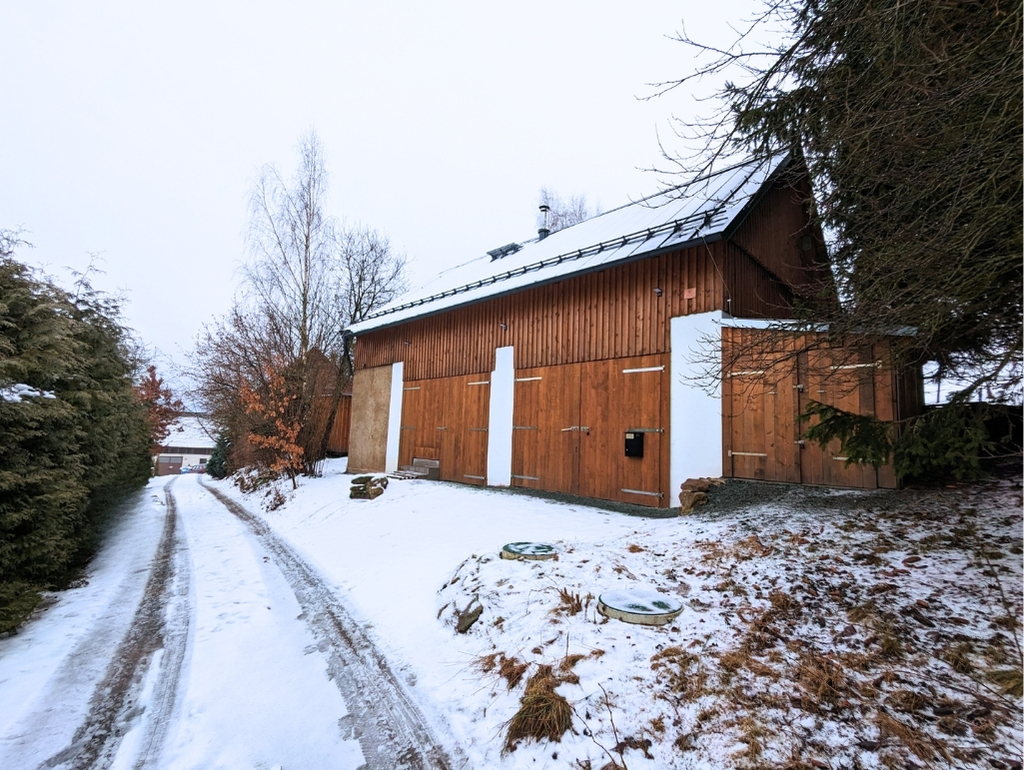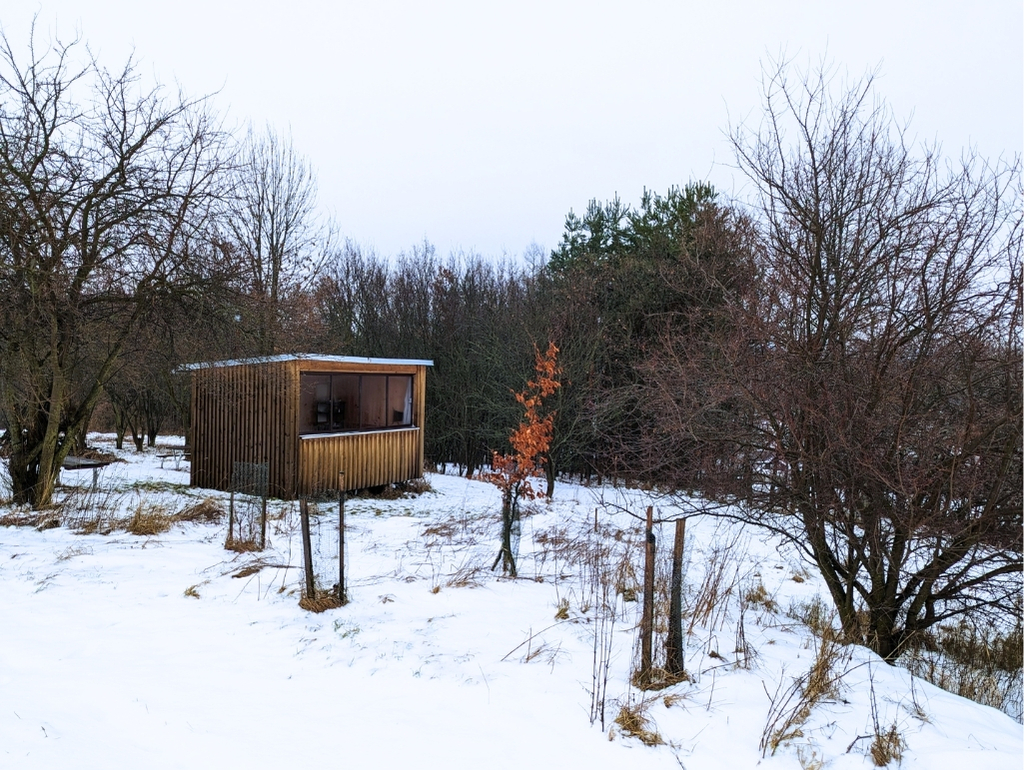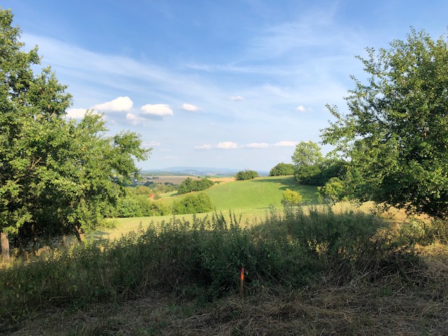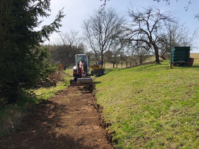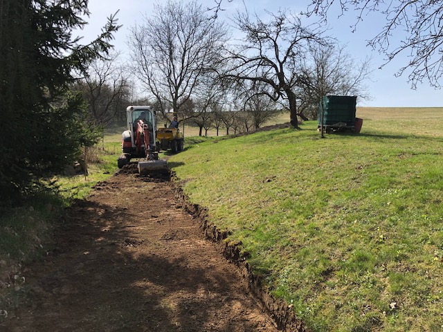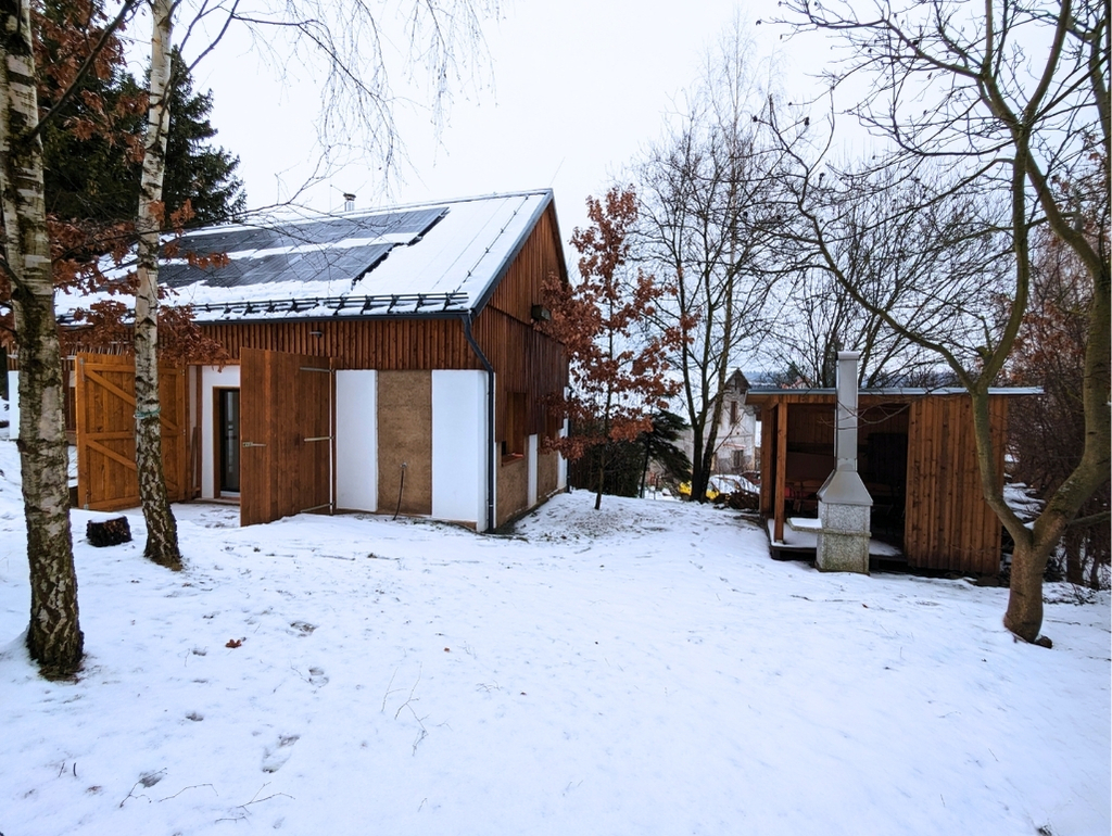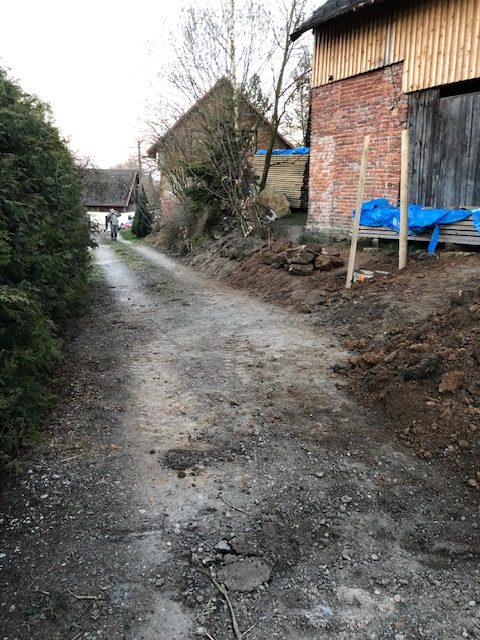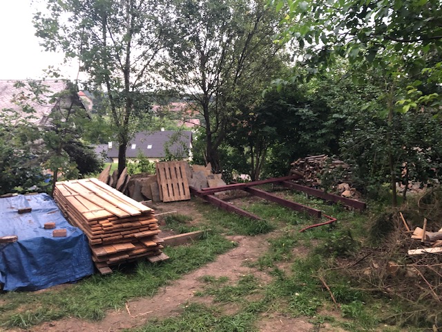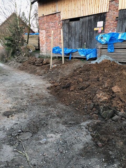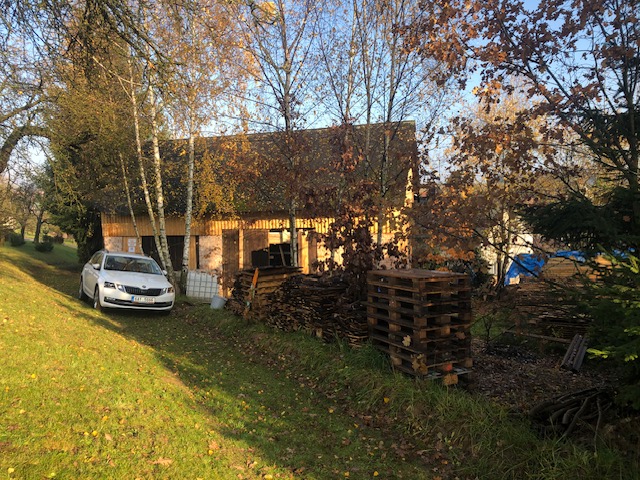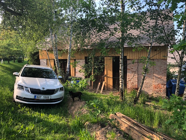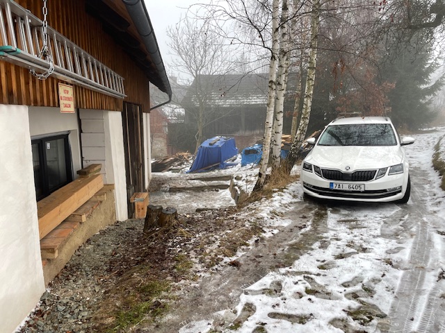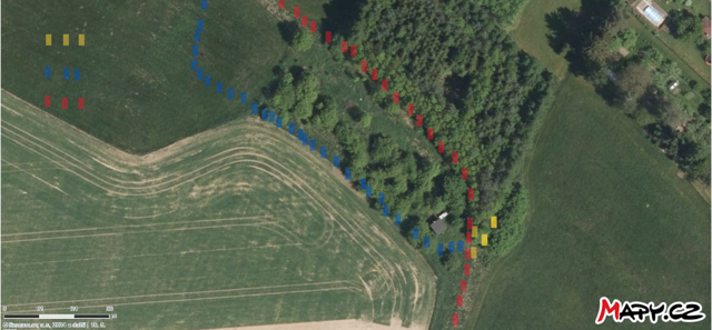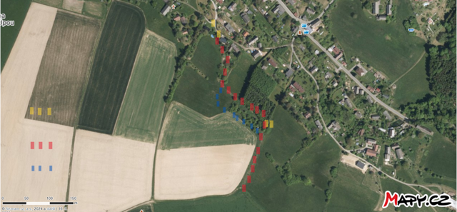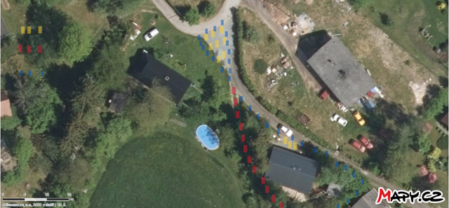 Červená: cesta / Žlutá: parkování / Modrá: hranice pozemku
